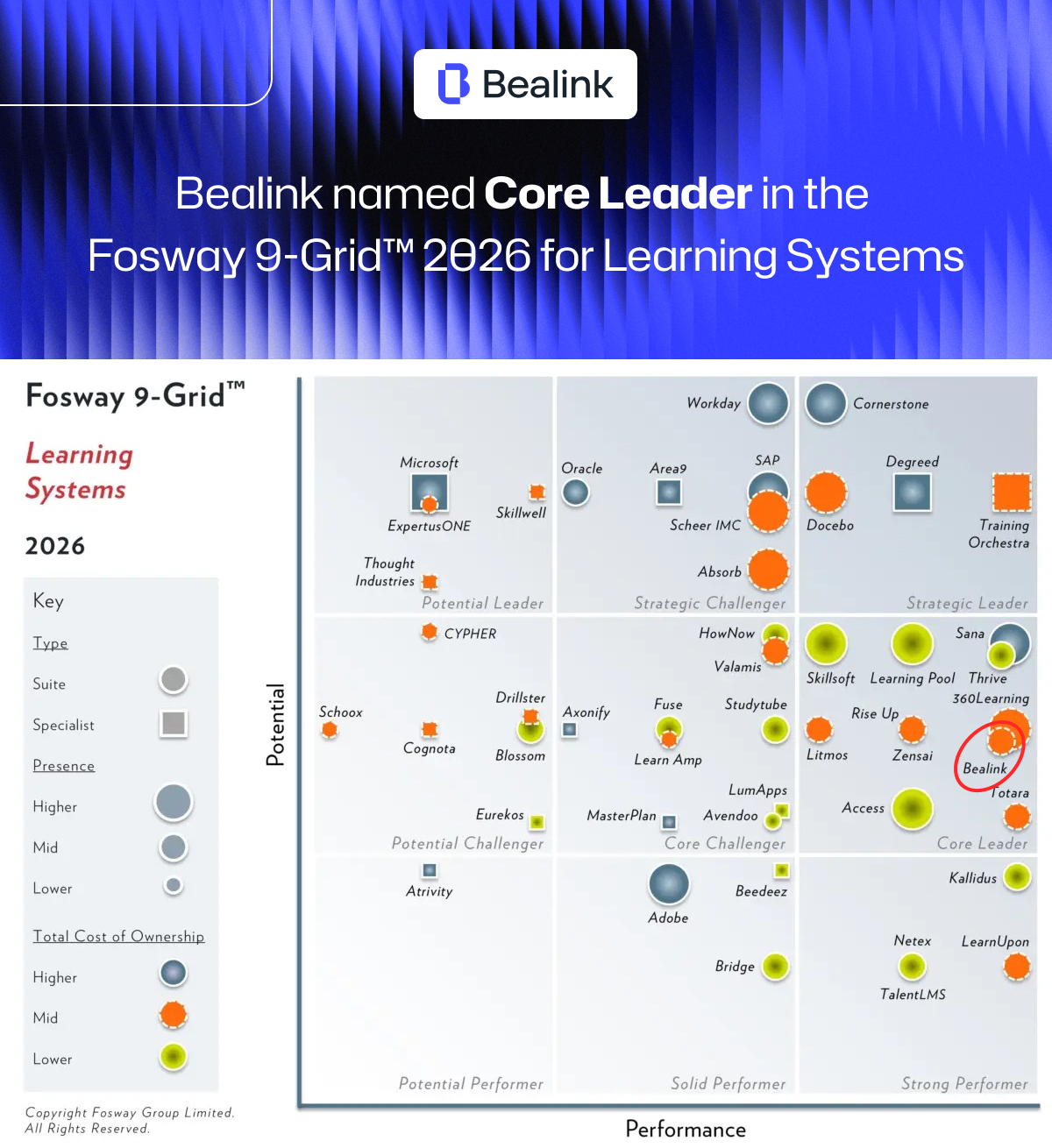 Bealink named Core Leader in the Fosway 9-Grid™ 2026 for Learning Systems