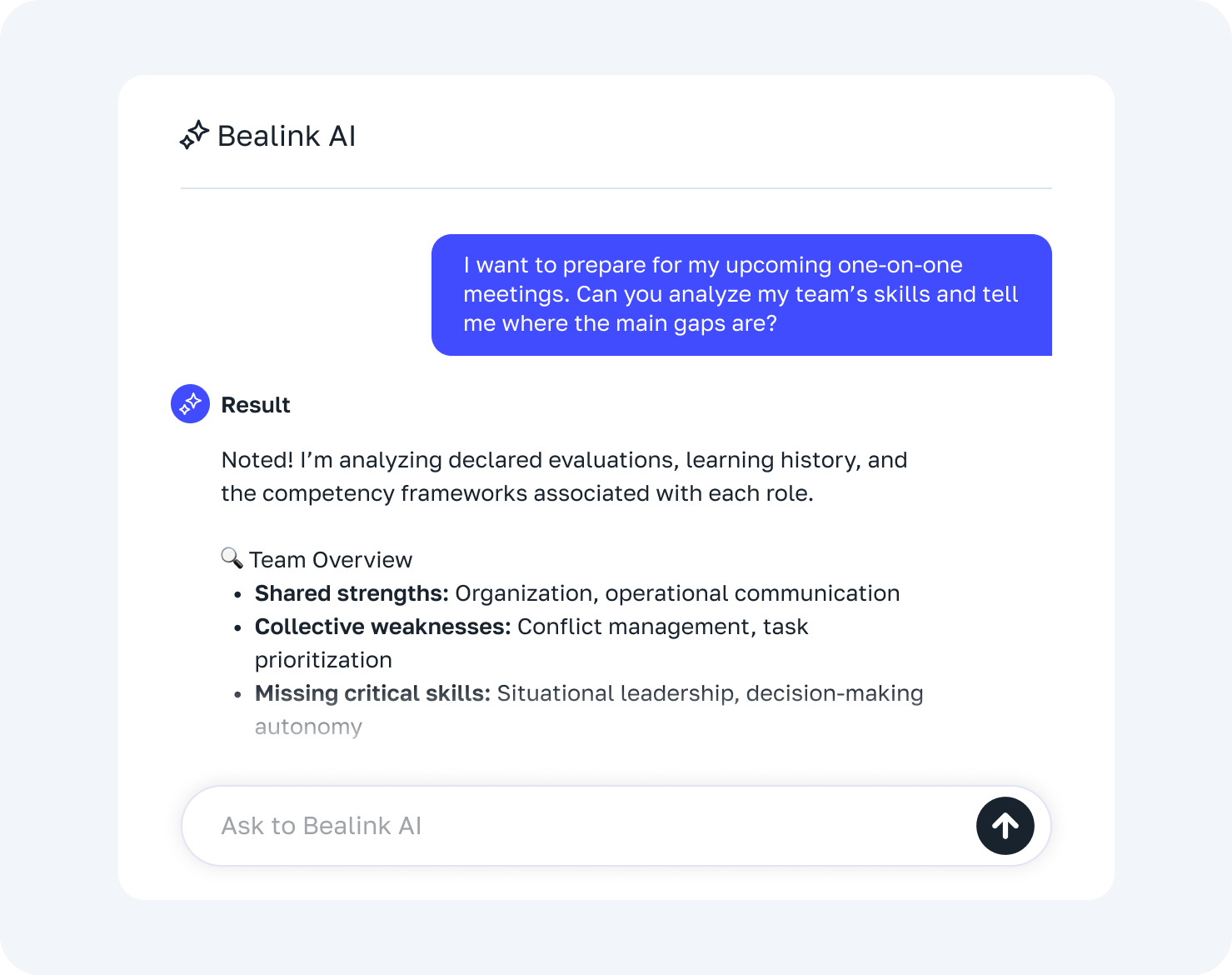 Empower managers with intelligent guidance. From spotting team skill gaps to recommending learning paths and actionable development plans, our AI helps leaders support growth and make better talent decisions.