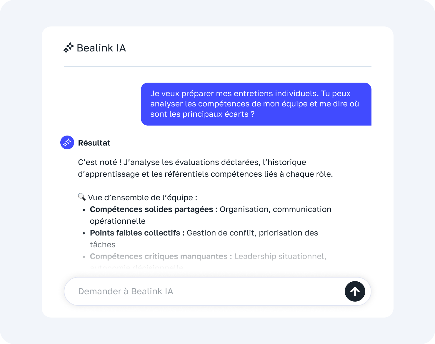 Offrez aux managers un accompagnement intelligent. De l’identification des écarts de compétences au sein de leurs équipes jusqu’aux recommandations de parcours d’apprentissage et de plans de développement concrets, notre IA aide les leaders à soutenir la croissance et à prendre de meilleures décisions en matière de talents.